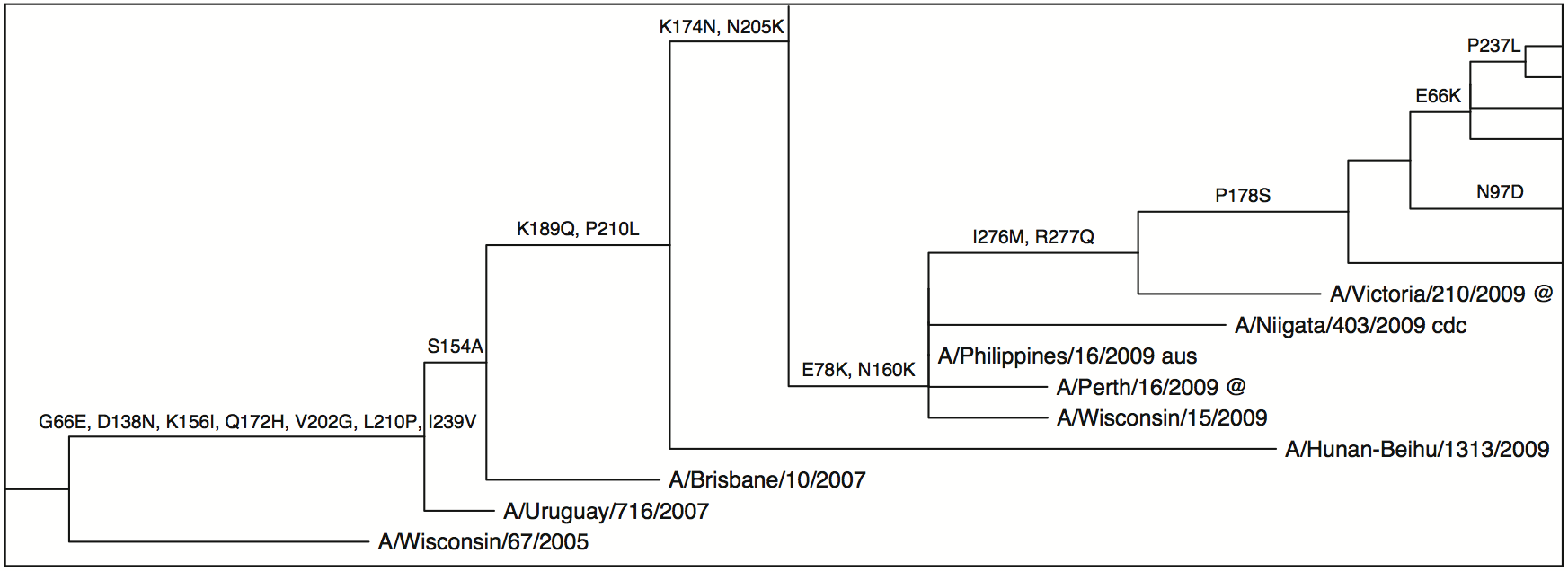 alignment.namesfile and write a new tree calledsubstitutions.tree. It will also create a table of all synonymous and non-synonymous substitutions in a tab-separated values files calledsubstitutions.tsv. It specifies the node/branch number, codon change and amino acid change for the substitutions. This can be opened in a text editor or a program like Excel. You may find it useful to take a look at the list of your sequences inalignment.names. Each line has the name of one sequence. You can edit the names of your sequences in this file. The only hard rules are to keep the same order of sequences and to avoid using commas and parentheses. For example, you could rename "A-URUGUAY-716-2007" to "A/Uruguay/716/2007 cdc @". You may find it easier to do this kind of renaming in this file rather than in a tree viewing program or graphics editing program. If you make changes to the alignment.names and save the file (it must keep the same name), you can generate a new tree file by clicking the 'Re-annotate' button. Note that you do not have to do this re-annotating at the time of your initial analysis. Simply open the Annotator program (by double-clicking on treesub.jar), select the same alignment file (in the same directory, with all the miscellaneous results files) and click 'Re-annotate'. -