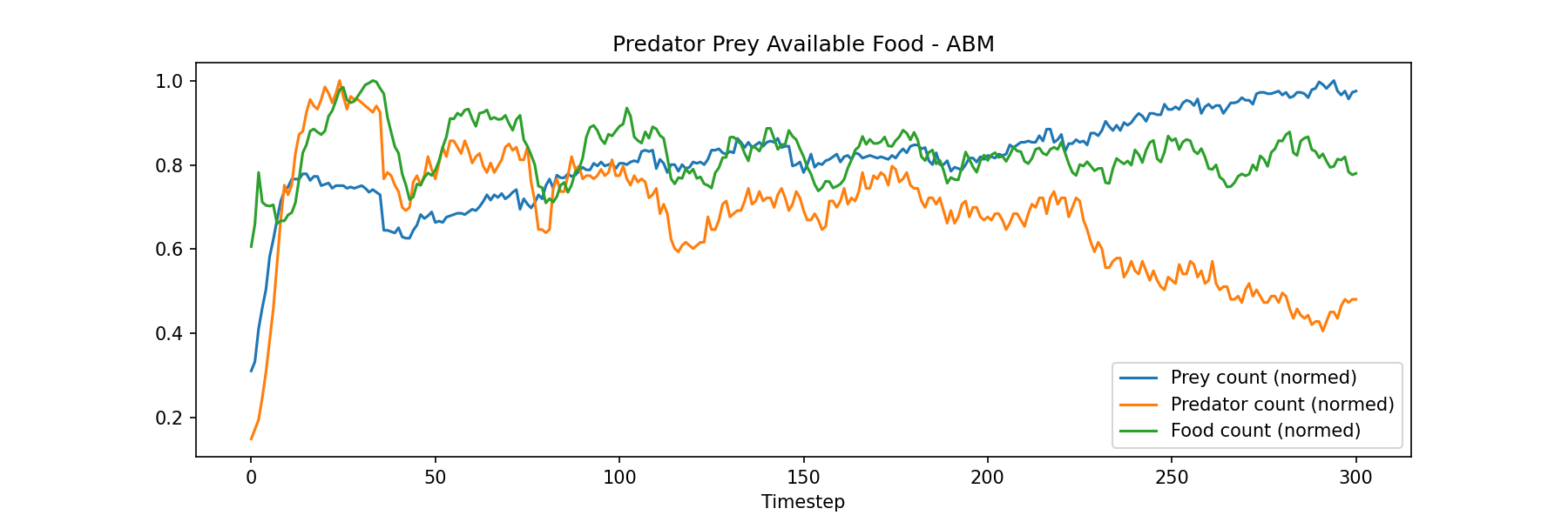 In the current model, all randomness is derived from the agents' position on the grid relative to other agents. What if there was also some probability $p_i$ associated with each one of the actions (moving, eating, reproducing)? And what if the decision also depended on the state of the system near the agent, such as the presence of a predator and food availability?