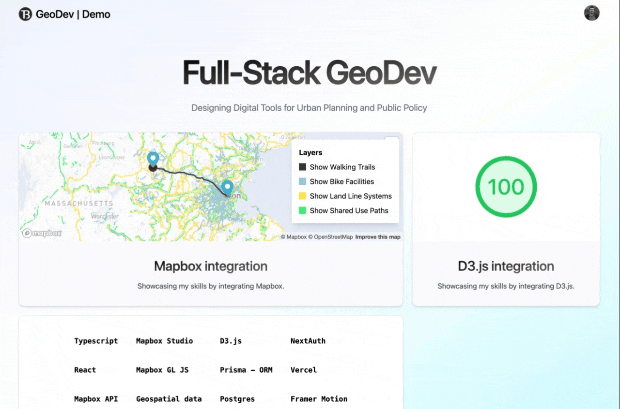 ๐ GeoDev is a cutting-edge project showcasing the integration of Mapbox and D3.js with Next.js and TypeScript. It allows users to interact with geospatial data, visualize routes, and toggle various map layers for enhanced urban planning and policy analysis.
