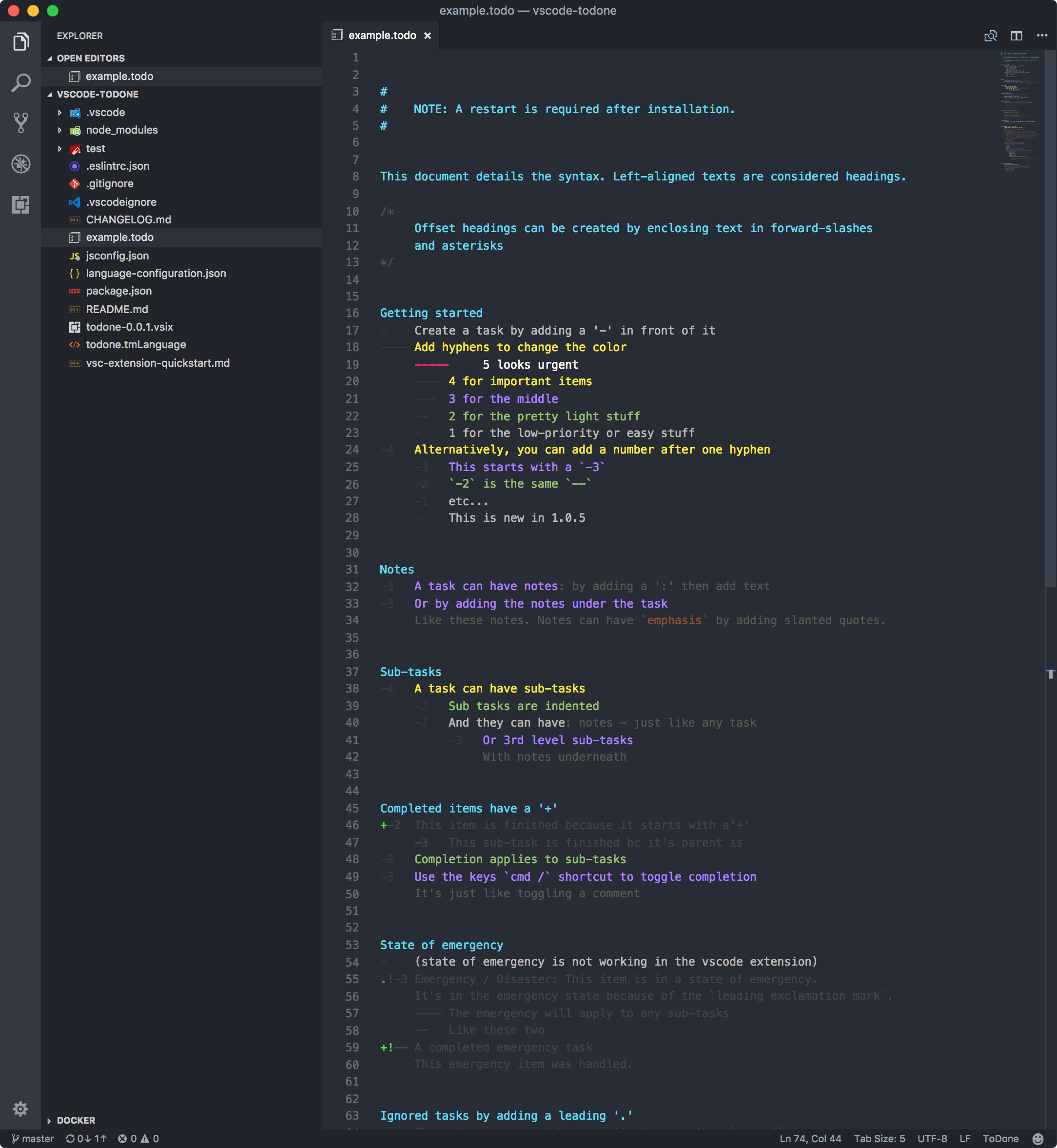 The language syntax is ToDone, and files with the extension todo are automatically set to the this language syntax.