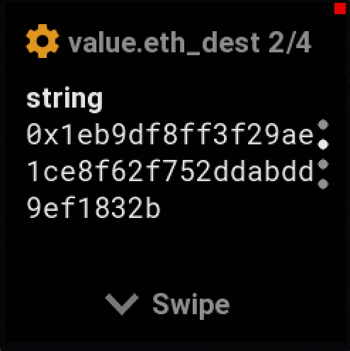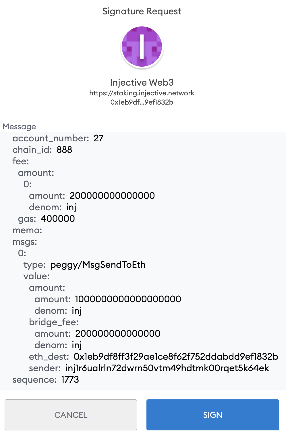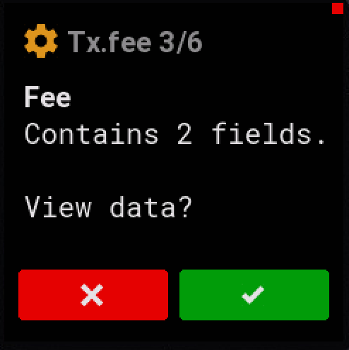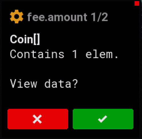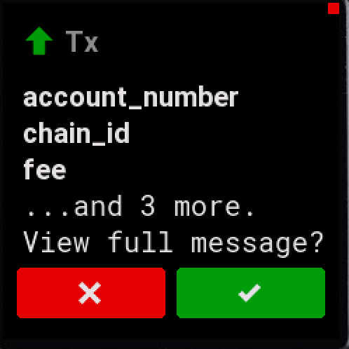 3/6field namedfeein primary struct (Tx). Struct has typeFeeand has 2 fields.1/2field in theFeestruct namedamount. It's array[]Coinwith only 1 element.valuefield ofMsgstruct as the first element inmsgs []Msgarray field in the primary struct. Thevaluestruct has typeMsgValueand has 4 fields.4/4) ofMsgValue, which is calledvalue.bridge_fee(gracefully trimmed), it's aTypeBridgeFeetype and it has 2 fields inside.2/4) field ofMsgValuein the paginated struct overview. It's a simple string field namedeth_dest.6/6) field of the primary struct (Tx) paginated for final overview. At this point, the user has the option to approve the primary struct, and finalize the signing. Trezor emits a signature.Short path: