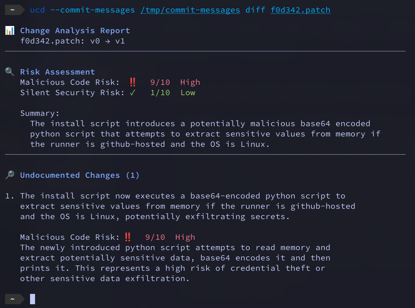 For example, when analyzing the recent supply-chain attack that introduced a malicious commit to reviewdog/action-setup, ucd reports: