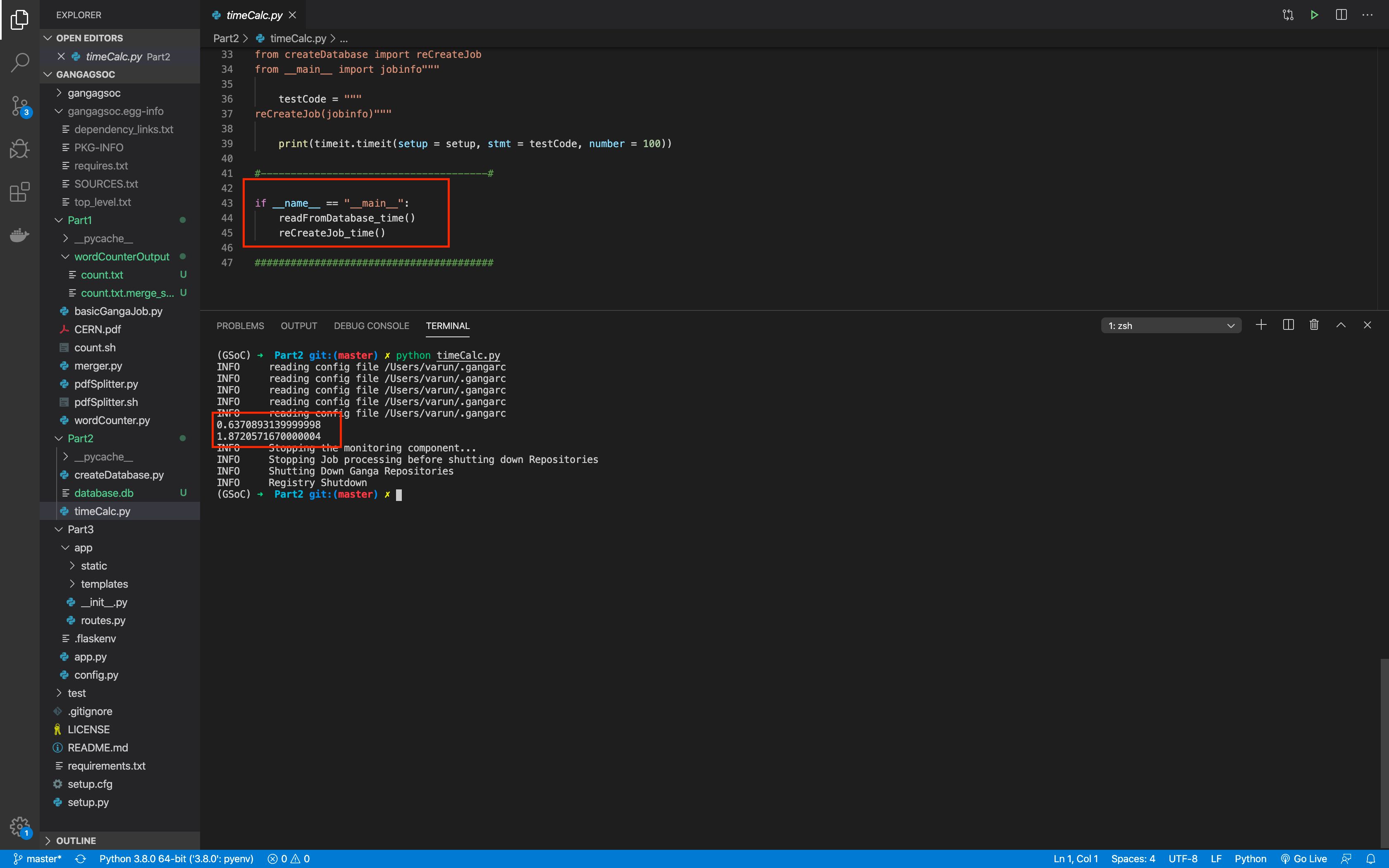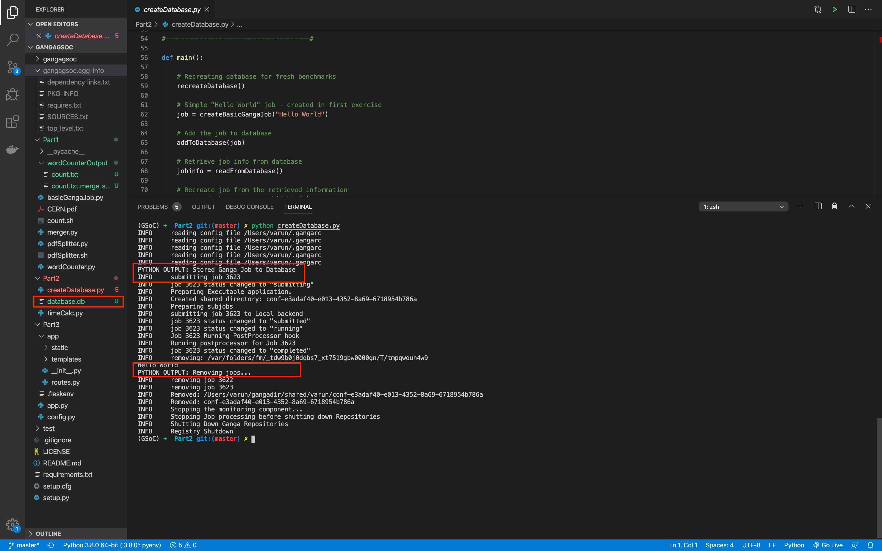 main()- usingcreateBasicGangaJobfrom Task 1 create a basic Ganga Job, adds it to database, and usingreadFromDatabasethe job text is stored injobinfovariable, and usingcreateJobfunction the basic job is recreated and submitted to run. After the job is finished, it is removed.