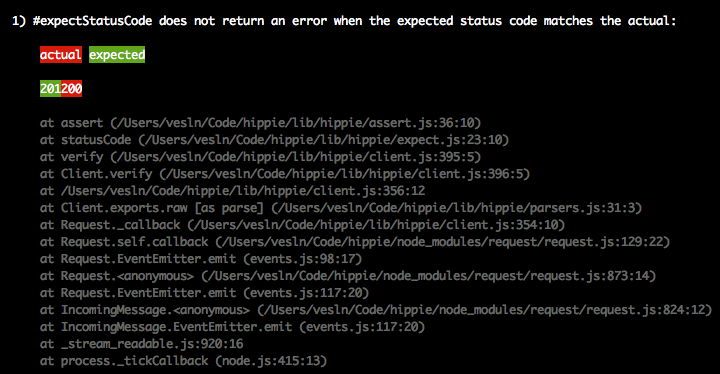 hippie.assert.showDiff = true;Since most of the time your test setup is going to be the same, you can simply create a helper function for your tests that will take care of the repetitive setup: