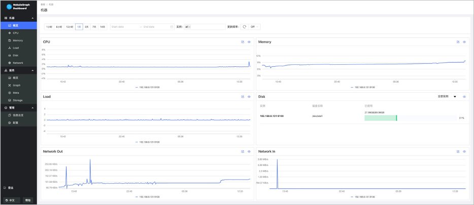 - The status of all the machines in clusters, including CPU, memory, load, disk, and network.
