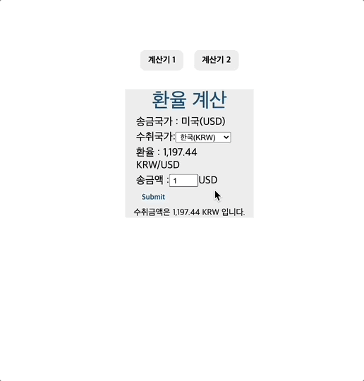 - 송금액을 입력한 후 Submit 버튼을 누르면 수취금액이 출력된다.