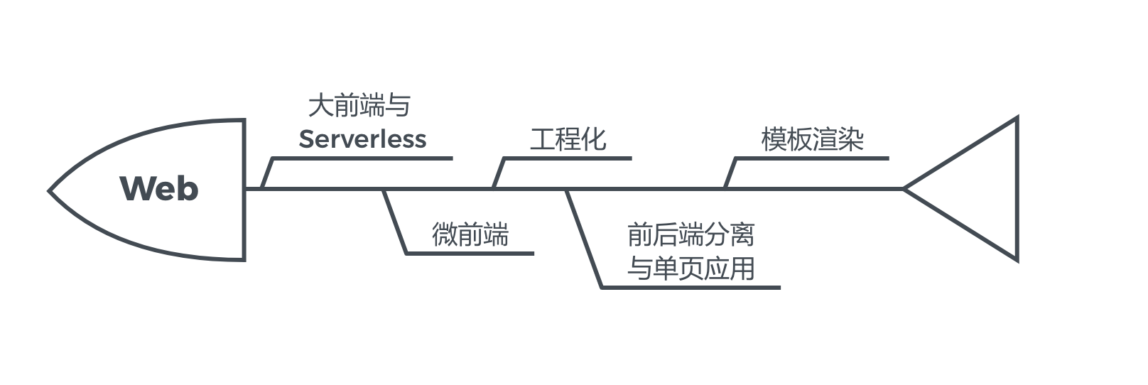 有趣的是,当我们站在不同的时间点,这三个阶段的划分也是不一致的,以目前笔者的认知而言,划分为了:模板渲染、前后端分离与单页应用,工程化与微前端,大前端与 Serverless 这三个不同的阶段。