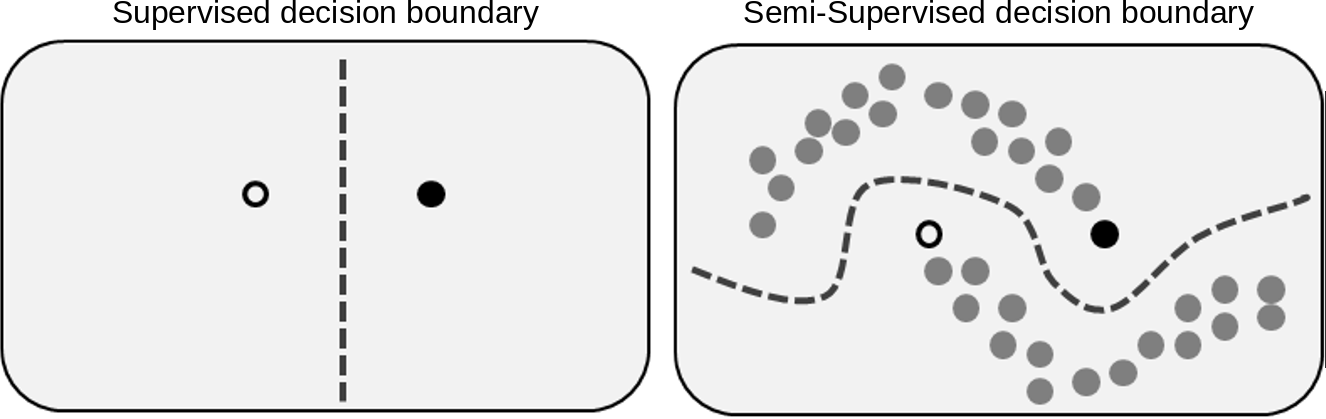 An example of the influence of unlabeled data in semi-supervised learning. (Image source: Wikipedia)If you find any errors, or you wish to add some papers, please feel free to contribute to this list by contacting me or by creating a pull request using the following Markdown format: