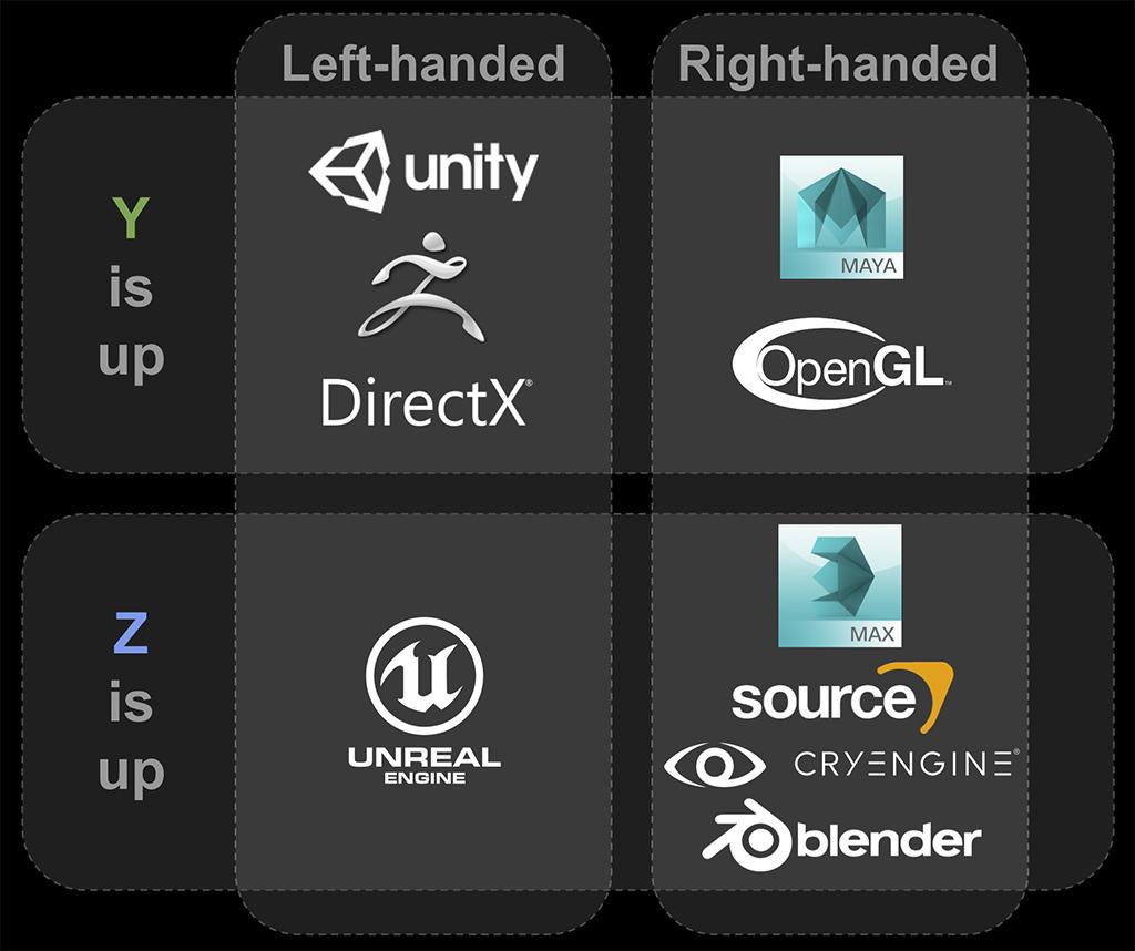 - Reversing any one of the X, Y or Z axii is enough to go from right-handed to left-handed, and vice versa.